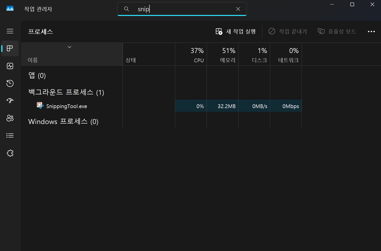 - Tip: 만약 'Snipping Tool'이 보이지 않는다면, '자세히' 버튼을 눌러 모든 프로세스를 확인해 보세요. 또한, 이 방법은 일시적인 해결책이므로 재부팅 시 다시 실행될 수 있습니다.